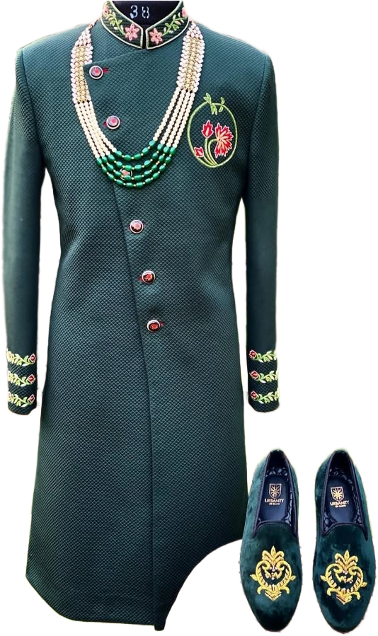 Make a powerful statement with our [Dark Green/Forest Green] Textured Sherwani Set. Featuring intricate floral embroidery on the collar and chest, stylish asymmetric button placket, and matching embroidered velvet loafers. Complemented by a multi-layered beaded mala, this ensemble is perfect for weddings, receptions, and grand festivities.”