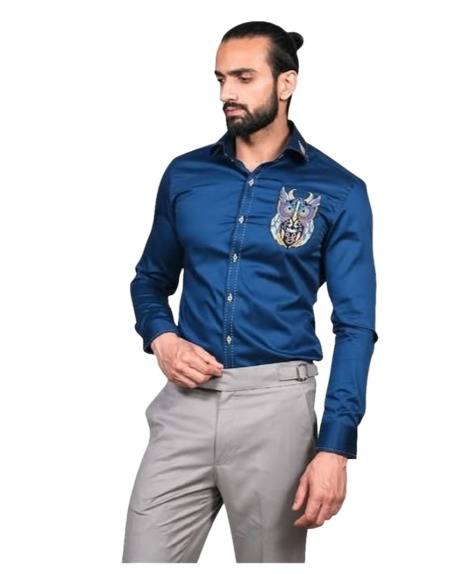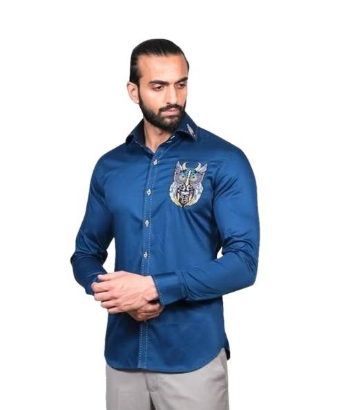 wearing a long-sleeved collared shirt in a deep shade of blue, possibly a navy or royal blue. The shirt has visible light-colored stitching accents along the button placket, extending towards the bottom hem.