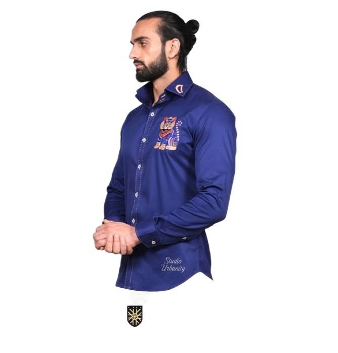 man in a deep royal blue long-sleeved collared shirt. The shirt has striking white stitching along the button placket and cuffs, providing a strong contrast. On the left chest, there’s a colorful, intricate embroidered design of what appears to be a stylized tiger or similar large cat, depicted in shades of orange, white, and black with some blue accents. Below the placket, near the hem, the words “Studio Urbanity” are printed vertically in white script. The man has dark hair tied back in a bun and a beard. He is shown from the side, looking towards the left of the frame, with his hands clasped in front. A small dark emblem with a star-like design is visible at the very bottom center of the image.