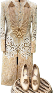 Step into timeless elegance with our exquisite [Color, e.g., Golden Beige] Embroidered Sherwani Set. Perfect for grooms and special occasions, this ensemble features intricate traditional embroidery, a classic band collar, and is complemented by a multi-layered pearl mala and matching ornate mojaris. A truly regal statement for your momentous day.”