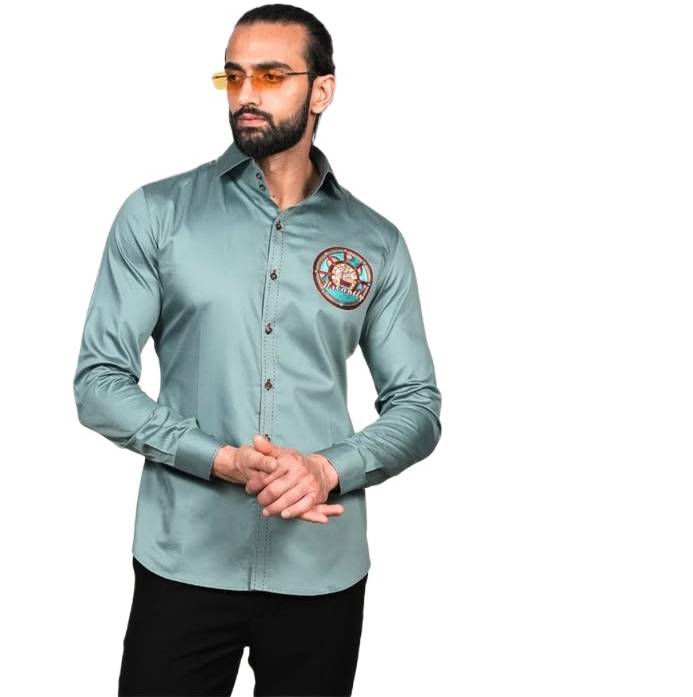 A prominent, circular embroidered design is featured on the left chest. This intricate design appears to be a stylized rendition of an animal’s face, possibly a lion, with elements that give it a fragmented or mosaic appearance. The design incorporates various earthy and warm tones, including shades of orange, brown, teal, and off-white.