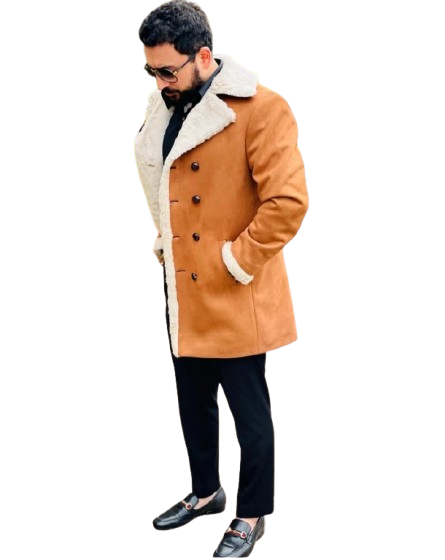 men’s light grey peacoat or double-breasted jacket.