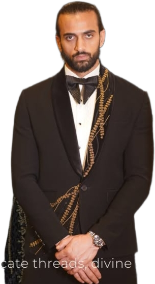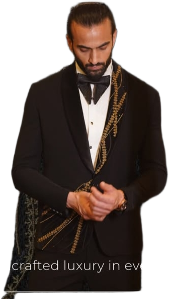 This premium black tuxedo is a masterpiece of modern elegance, designed for men who want to make a bold, refined statement. The sleek silhouette is enhanced with luxurious golden sequin embroidery cascading across the front and sleeve, creating a striking asymmetrical design. It features classic satin shawl lapels, a single-button front, and a crisp white shirt layered under a coordinating waistcoat. A structured bow tie and subtly embellished dupatta (cape) complete the regal look. Ideal for grooms, receptions, sangeet nights, or black-tie events — this ensemble captures the essence of handcrafted luxury and contemporary sophistication.