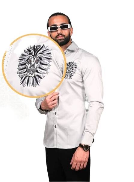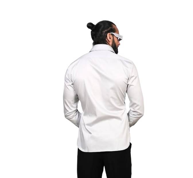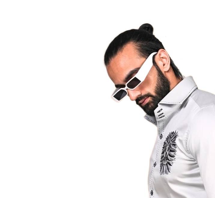 The image features a man, likely in his late 20s or early 30s, standing against a plain white background. He has a dark beard and mustache, and his dark hair is pulled back, revealing sunglasses with thick white frames.