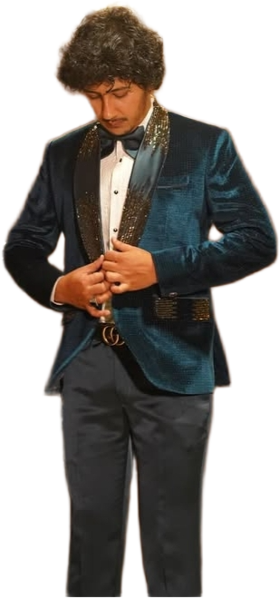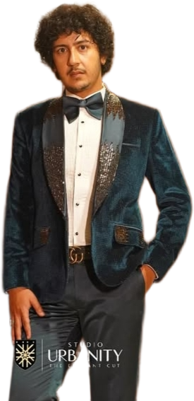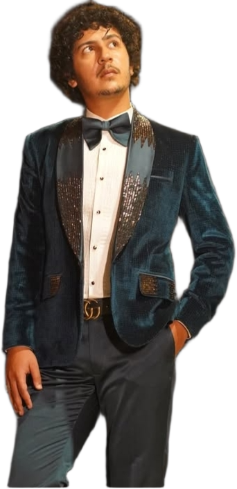 Stand out in style with this teal velvet tuxedo featuring sequin-detailed satin lapels, flap pockets, and a sleek bow tie — a bold choice for receptions, parties, and special occasion