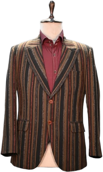 This is a close-up, eye-level shot of a men’s blazer displayed on a mannequin. The blazer features a vertical stripe pattern in shades of brown, black, and deep red. It has a notched lapel, a two-button closure, and two flap pockets at the hips. A deep red, collared shirt is visible underneath the blazer, complementing the red stripes. The background is plain white.