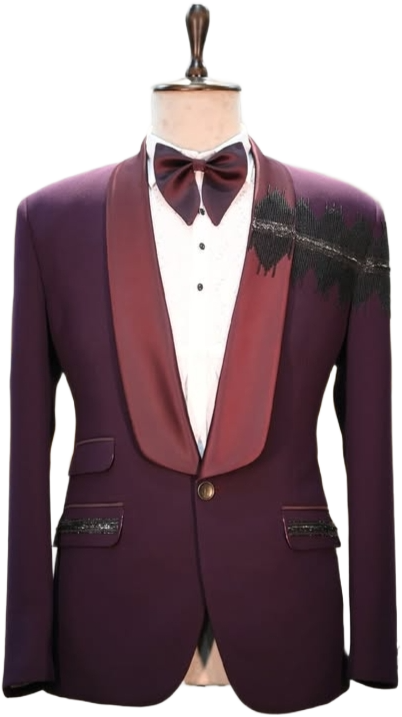 Beneath the jacket, a classic white dress shirt with black buttons is visible, paired with a matching bow tie that echoes the plum/maroon color scheme of the jacket and its lapels. The overall design suggests a formal garment intended for making a bold and sophisticated statement.
