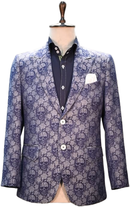 The blazer features a distinctive overall pattern of skulls and floral or vine motifs, rendered in shades of blue and possibly light grey or off-white. The pattern is intricate and covers the entire fabric of the jacket, giving it a unique, edgy yet sophisticated aesthetic. The fabric itself appears to have a textured or jacquard weave, which enhances the visual depth of the pattern.